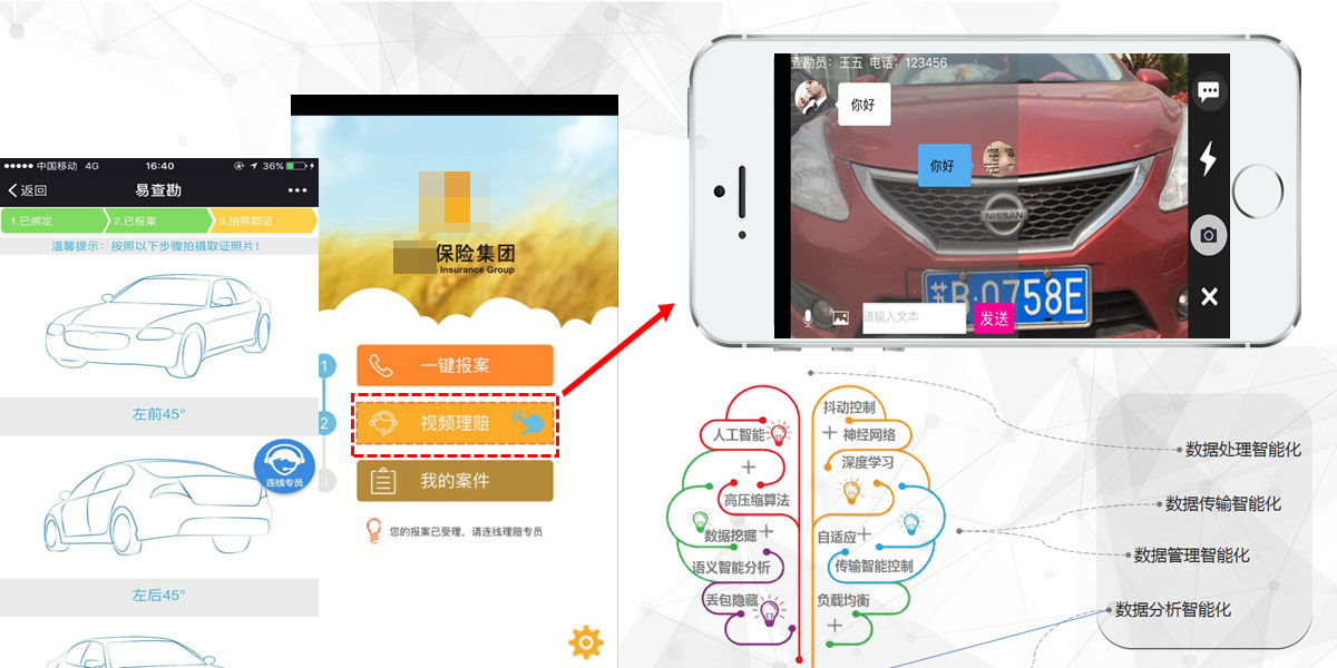 车辆越来越多,客户对理赔速度要求越来越高,目前传统理赔方式难以满足要求,保险公司现场查勘员需求更多,人力成本高,对于路况复杂、偏远的地方,也不方便查勘员去现场。我们根据利宝保险的实际需求研发了车险移动视频查勘平台,该平台通过手机作为事故现场查勘工具,结合人工智能,让客户、车商等社会人员成为现场查勘人员,核损人员在办公室集中处理事故,大大降低了查勘定损成本,节约了车主时间,提升了理赔满意度,本技术还可应用到各种视频客服场景。